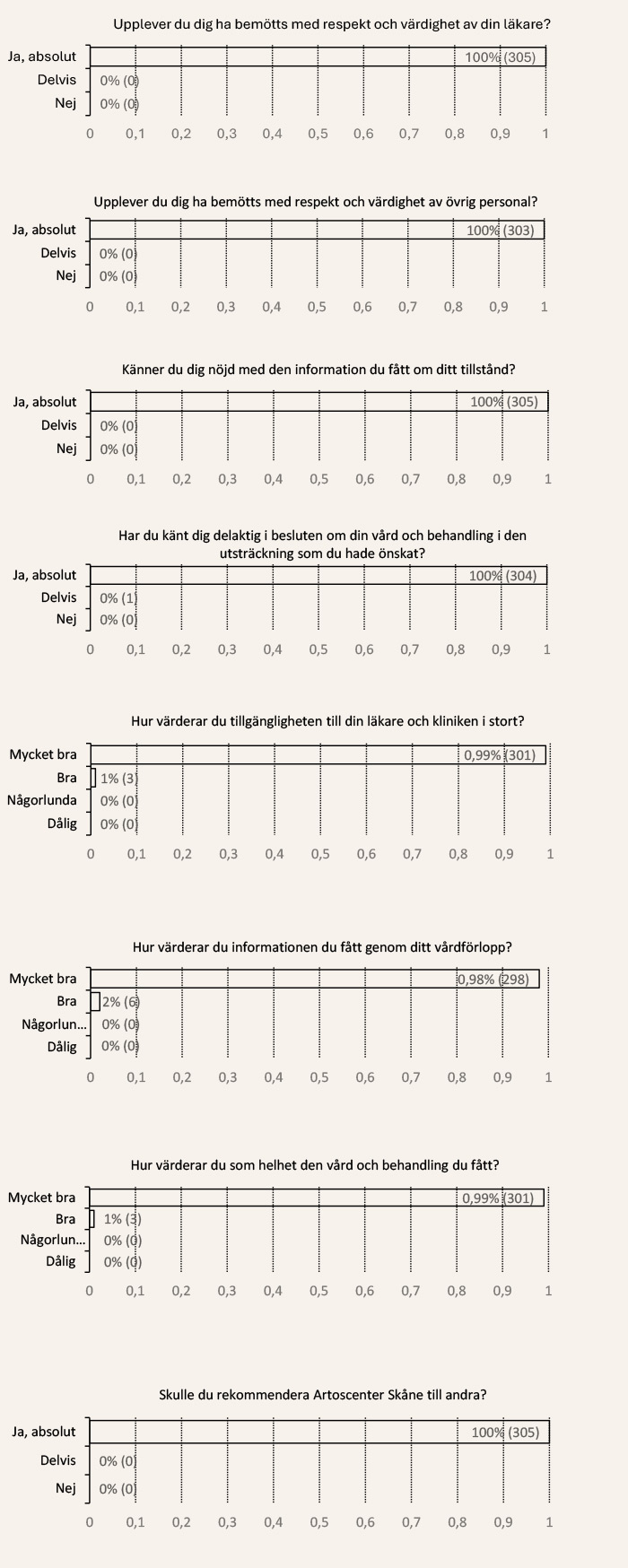 2025 anförtroddes Artroscenter Skåne att vara del i 403 patienters vårdkedja för deras planerade höft- eller knäproteskirurgi. 305 av dessa inkom brevledes med svar på klinikens anonyma patientnöjdhetsenkät (svarsfrekvens 76%). Här presenteras hur de 305 patienterna besvarade enkäten: